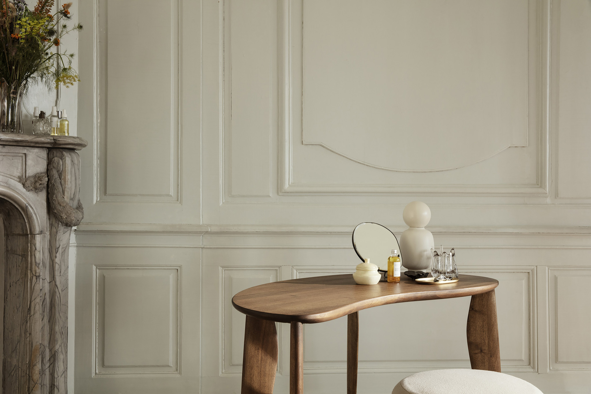 Nieuw bij Ferm Living is de Feve Desk, gemaakt van massief FSC™-gecertificeerd Europese walnoot. Het tafeltje heeft een organische, delicate uitstraling en neemt weinig ruimte in beslag. De combinatie van het elegante silhouet en walnoot zorgt ervoor dat de Feve Desk het pronkstuk is in elke ruimte. Gebruik het ontwerp als bureau, bijzettafeltje in de inkom of als make-up tafel.