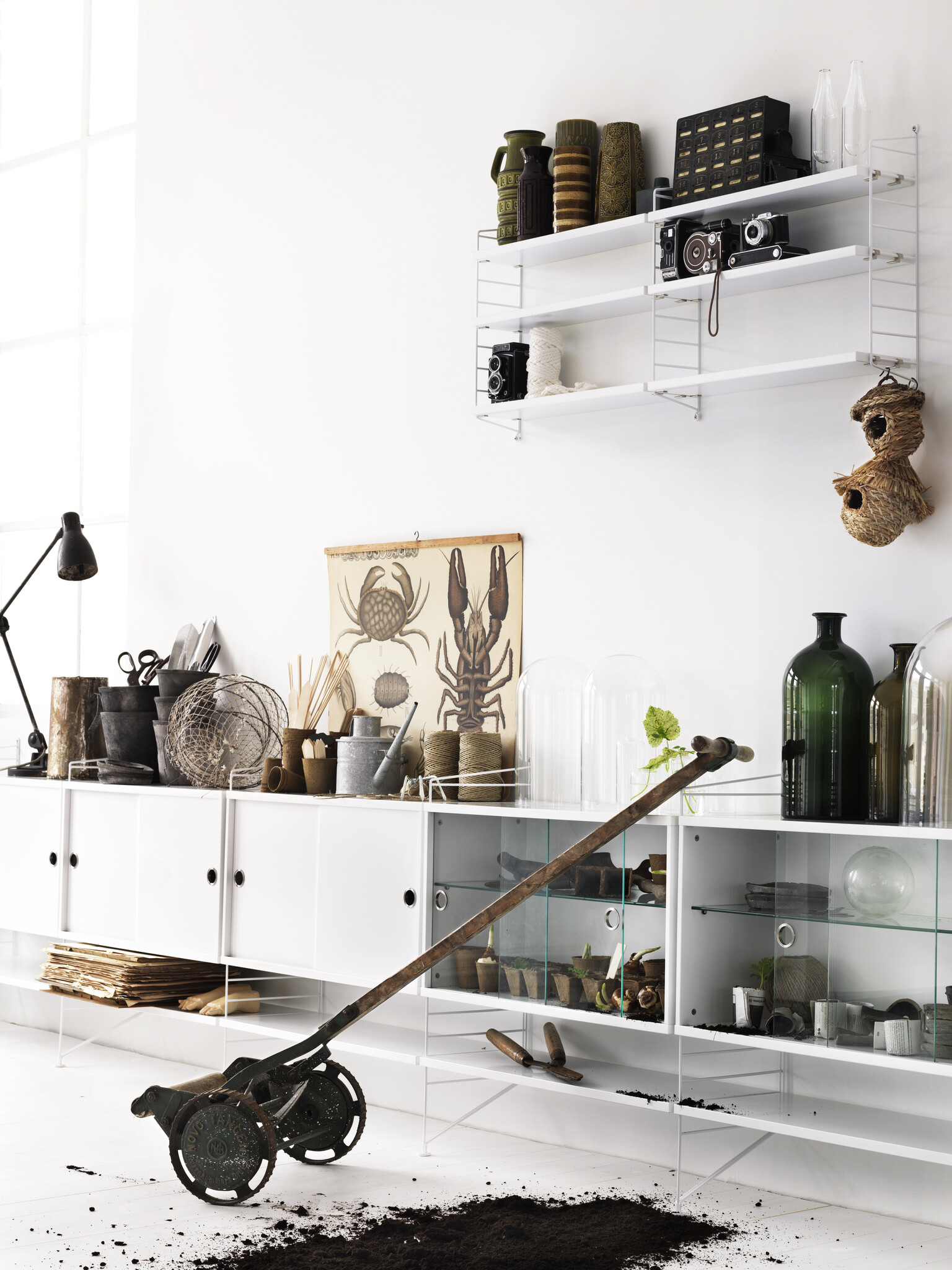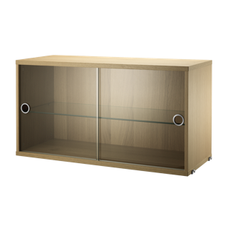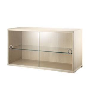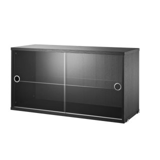 De vitrinekast met glazen schuifdeuren is verkrijgbaar in een breedte, 78 cm, en een diepte, 30 cm. De vitrinekasten passen in alle draadpanelen van String® System als de panelen 30 cm diep zijn. Het is visueel aantrekkelijk om een gedurfder element aan je plank toe te voegen, zoals een kast, waardoor je ook veel extra opslagruimte hebt en de mogelijkheid om iets breekbaars te presenteren. De vitrinekast bestaat uit één verstelbare binnenplank van glas en de interne afmetingen zijn: diepte 26 cm, breedte 74 cm en hoogte 38 cm. De vitrinekast wordt ongemonteerd geleverd.