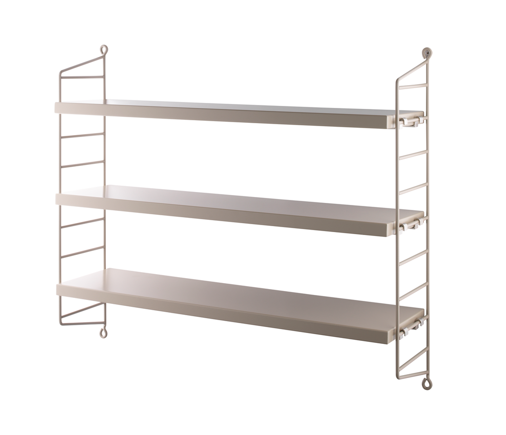 String Pocket is een compleet pakket met twee zijpanelen en drie plankjes. Je kunt kiezen uit een reeks kleuren en materialen. String pocket kan op verschillende manieren worden gecombineerd: in een pakket krijg je één plank, met twee pakketten kun je maximaal drie secties opbouwen.