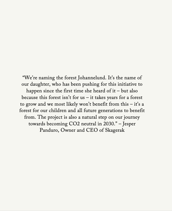 Als designmerk 'neem' je natuurlijk, zoals je hierboven ziet, bepaalde grondstoffen van de aarde om producten te produceren. Heel belangrijk is om dan ook zoveel mogelijk terug te geven. In het voorjaar van 2022 gaat Skagerak 90.000 bomen planten op een gebied van 42 hectare in Noord-Jutland in Denemarken. Dit doen ze omdat ze van hout houden maar vooral omdat ze hun bedrijf zodanig willen runnen dat ze iets teruggeven aan de omgeving. Voor hun gaat het om het nemen van verantwoordelijkheid en een positieve bijdrage leveren waar en wanneer ze kunnen. Het bos moet onder meer zorgen voor CO2-opname, biodiversiteit en nieuwe natuurbeleving voor de lokale bevolking.