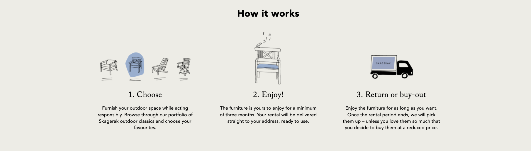 Rent is, zoals de naam doet vermoeden, een huurservice die Skagerak aanbiedt. Het voordeel hiervan is dat je je meubelen regelmatig kan wisselen en tegelijkertijd verantwoord handelt. Blader door het portfolio van Skagerak en kies je favorieten. Het meubilair is hierna van jou om minimaal drie maanden van te genieten. Geniet zo lang als je wil van de meubels. Zodra de huurperiode is afgelopen haalt Skagerak alles terug op - tenzij je in die tijd zoveel van ze bent gaan houden dat je besluit ze tegen een gereduceerde prijs te kopen!